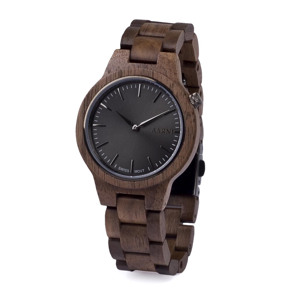 Aarni Vega Pähkel on varustatud Šveitsi ETA mehhanismiga, mis tagab suurepärase täpsuse. Pähkelipuu materjal loob soojase pruuni värvi ja atraktiivse loomuliku mustriga. Imeline pruun pähkelipuu värvus ja hallikas sihverplaat teevad selle kella parimaks valikuks igas olukorras. Mineraalklaas ja **linkide rihm** teevad sellest kellast igapäevase kasutamise jaoks ideaalse. Kell on pritsmekindel ja vee suhtes vastupidav.